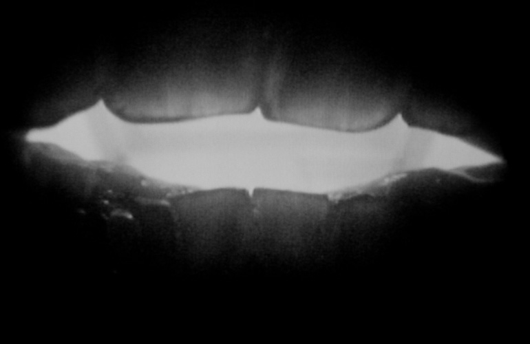 Shot from inside the mouth looking out, attempts to speak are emitted as flashes of light.