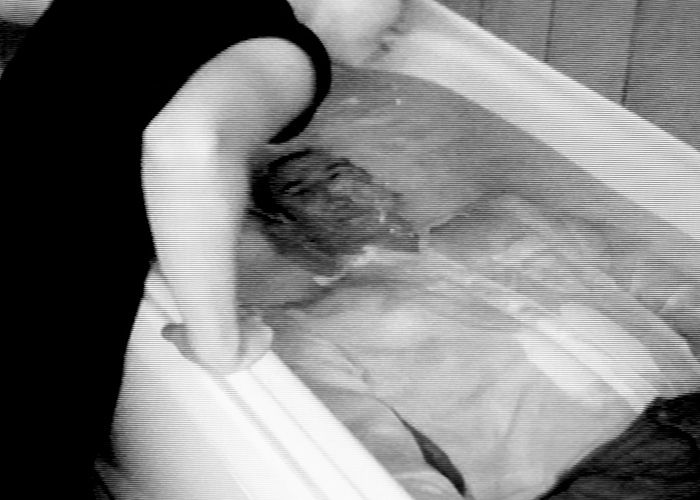 A fully clothed man lies submerged in a bath. A woman leans into the water to give him air every time he breathes out.